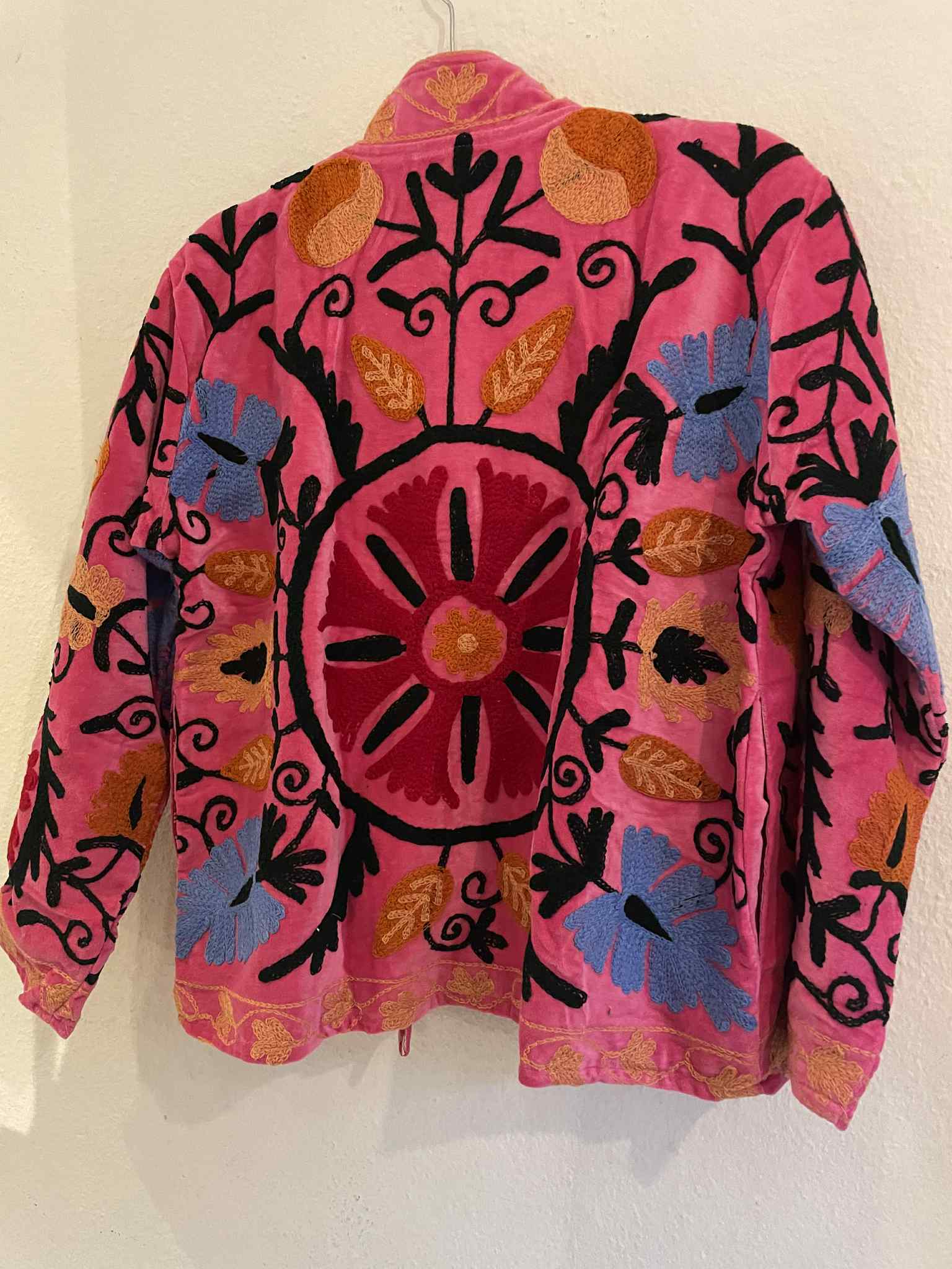 Suzani er et imponerende håndværk, der består af sirligt broderede blomster af farverig bomuldstråd. Håndværket stammer oprindelig fra Uzbekistan og spredte sig sidenhen til resten af central Asien. De smukke Suzanijakker vi netop har modtaget, består af blødt groftvævet bomuld med fine farverige broderier og et matchende vendbart for.