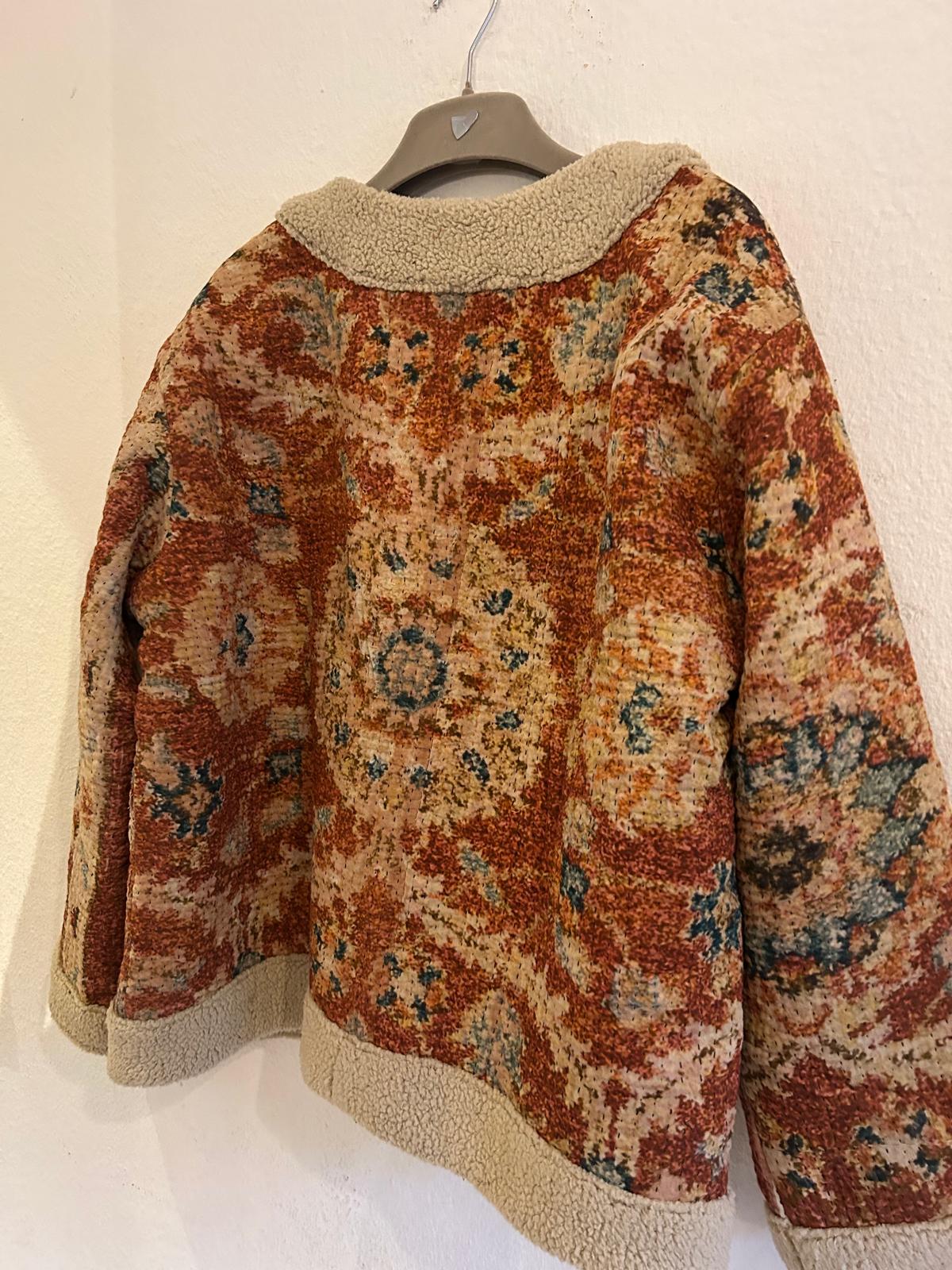 Denne skønne Sari-jakke/frakke er et lille mesterværk produceret af vores dygtige skræddere i Rajastan provinsen. Denne type er varm med et vendbart plysfor. Den kan dermed anvendes både på den flotte og farverige forside, samt med sari stoffet på indersiden og det lyse pelsfor ude, hvis du er i det humør De fleste sarijakker fås som efterårs- eller overgangsjakker, men er du vild med uniqueness-elementet, BOHO stilen, farverne, mønstrene og bæredygtigheds-elementet – kan du nu også lufte disse smukke unika-jakker i de kolde vintermåneder. Kom ind og kig på vores udvalg af de varme modeller. Eller få os evt. til at sende flere fotos af lige netop den model, som du har forelsket dig i.