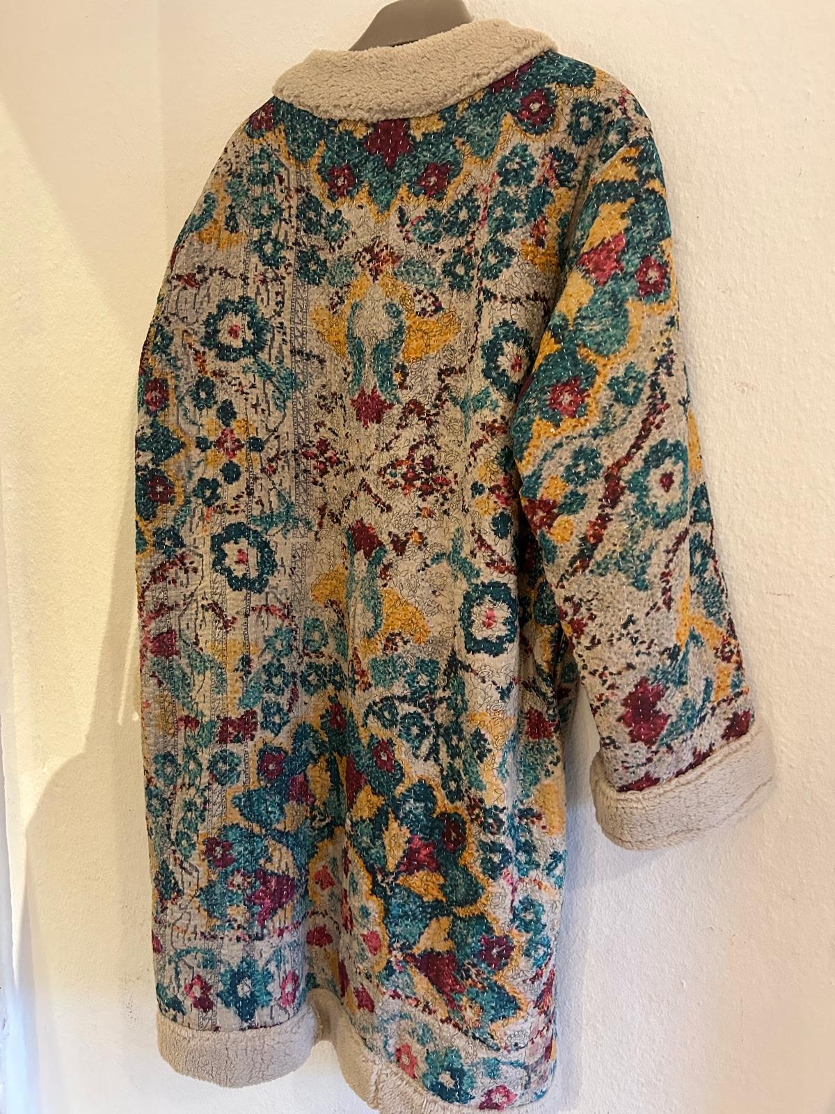 Denne skønne Sari-jakke/frakke er et lille mesteærk produceret af vores dygtige skræddere i Rajastan provinsen. Denne type er varm med et vendbart plysfor. Den kan dermed anvendes både på den flotte og farverige forside, samt med sari stoffet på indersiden og det lyse pelsfor ude, hvis du er i det humør De fleste sarijakker fås som efterårs- eller overgangsjakker, men er du vild med uniqueness-elementet, BOHO stilen, farverne, mønstrene og bæredygtigheds-elementet – kan du nu også lufte disse smukke unika-jakker i de kolde vintermåneder. Kom ind og kig på vores udvalg af de varme modeller. Eller få os evt. til at sende flere fotos af lige netop den model, som du har forelsket dig i.