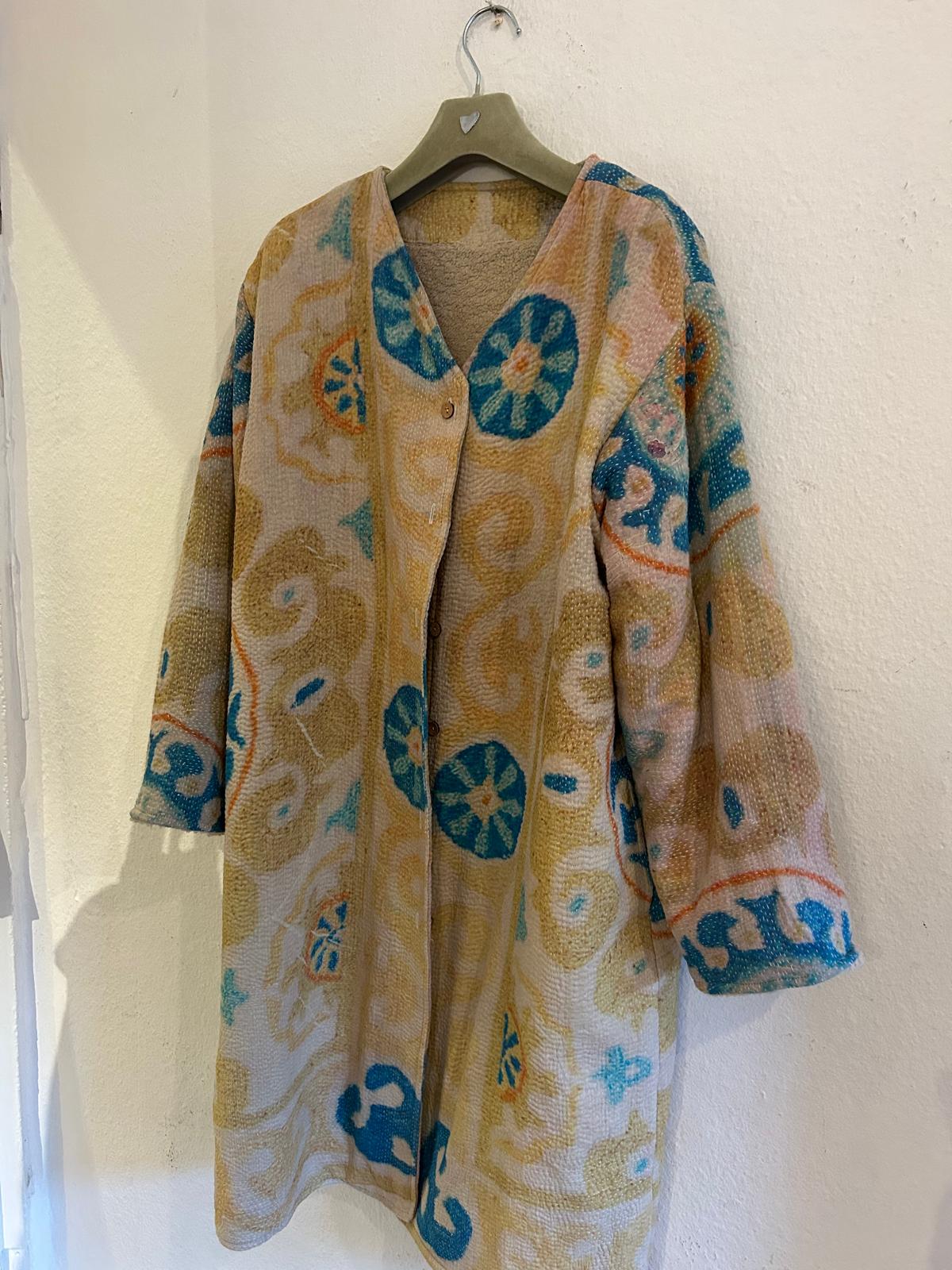 Denne skønne Sari-jakke/frakke er et lille mesteærk produceret af vores dygtige skræddere i Rajastan provinsen. Denne type er varm med et vendbart plysfor. Den kan dermed anvendes både på den flotte og farverige forside, samt med sari stoffet på indersiden og det lyse pelsfor ude, hvis du er i det humør De fleste sarijakker fås som efterårs- eller overgangsjakker, men er du vild med uniqueness-elementet, BOHO stilen, farverne, mønstrene og bæredygtigheds-elementet – kan du nu også lufte disse smukke unika-jakker i de kolde vintermåneder. Kom ind og kig på vores udvalg af de varme modeller. Eller få os evt. til at sende flere fotos af lige netop den model, som du har forelsket dig i.