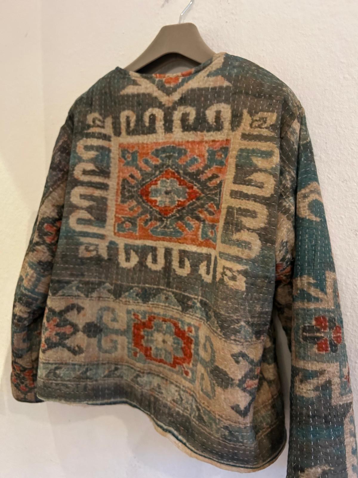 Denne skønne Sari-jakke/frakke er et lille mesteærk produceret af vores dygtige skræddere i Rajastan provinsen. Denne type er varm med et vendbart plysfor. Den kan dermed anvendes både på den flotte og farverige forside, samt med sari stoffet på indersiden og det lyse pelsfor ude, hvis du er i det humør De fleste sarijakker fås som efterårs- eller overgangsjakker, men er du vild med uniqueness-elementet, BOHO stilen, farverne, mønstrene og bæredygtigheds-elementet – kan du nu også lufte disse smukke unika-jakker i de kolde vintermåneder. Kom ind og kig på vores udvalg af de varme modeller. Eller få os evt. til at sende flere fotos af lige netop den model, som du har forelsket dig i.